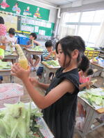 防火衣着装体験では、消防士さんが実際に普段着装している防火衣を、わずか30秒で着替えるという早業を披露していただきました。その後、子供用の防火衣を実際に着せてもらい、ヘルメットの重さや着装の難しさを体験しました。