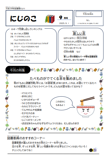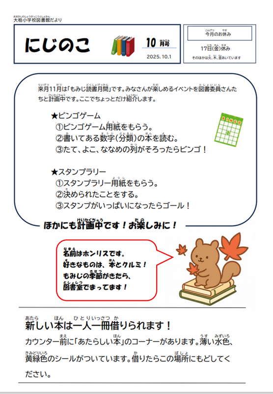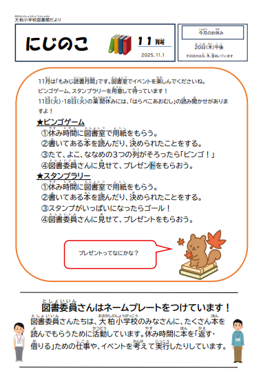 図書館だより 11月号 投稿日時 : 11/10 大柏小学校管理者 PDFはこちら⇒図書館だより11月号2025.11.pdf 0 {{options.likeCount}} {{options.likeCount}} {{options.unlikeCount}} {{options.unlikeCount}}