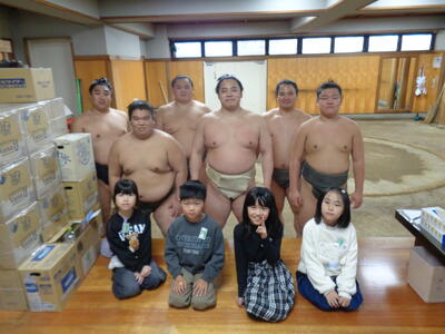 豆知識3:歳が一番下の力士(子供たちとの集合写真一番右側)は16歳でした。