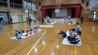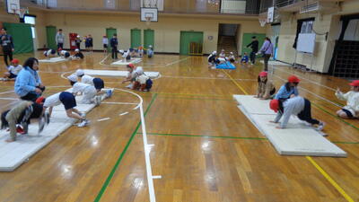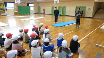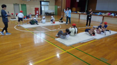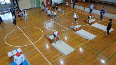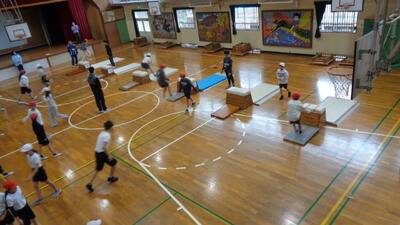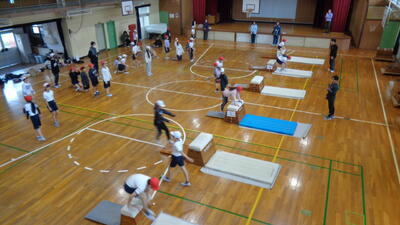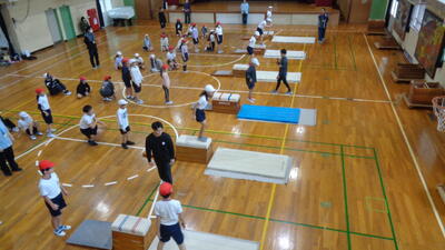 今日はゲストティーチャーをお迎えして、高学年には跳び箱、低学年にはマット運動の基本的なコツを学びました。