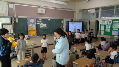 次に校長先生からは節分の話でしたが、地方には豆まき以外で鬼を追い払う方法があることを伝えました。例えば恵方巻を食べる、節分ソバ(島根、長野地方)を食べる、こんにゃく(四国地方)を食べるなどです。