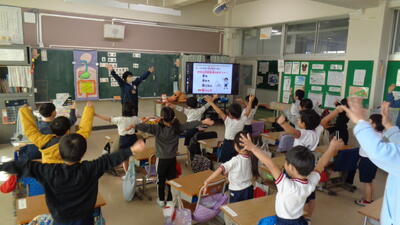 最後に2月の生活目標について、U先生から姿勢について話がありました。高学年は卒業式に出席するので、良い姿勢をしようと話があり、姿勢をよくする体操を行いました。