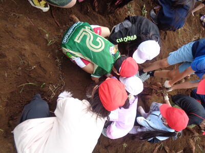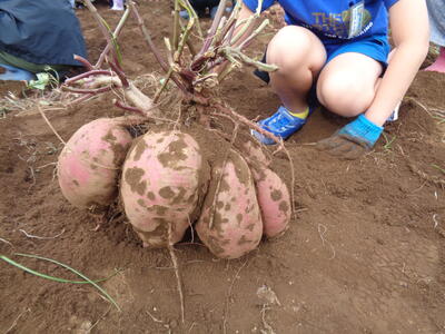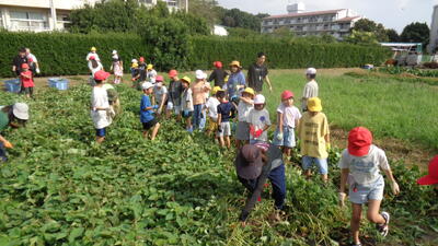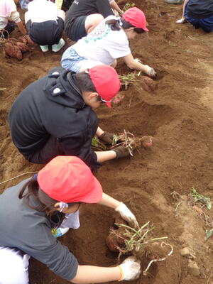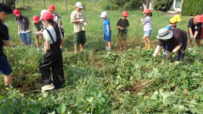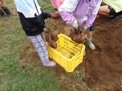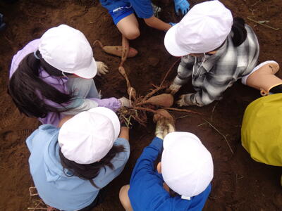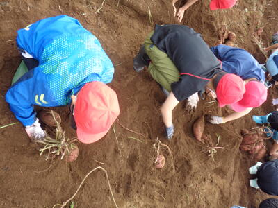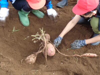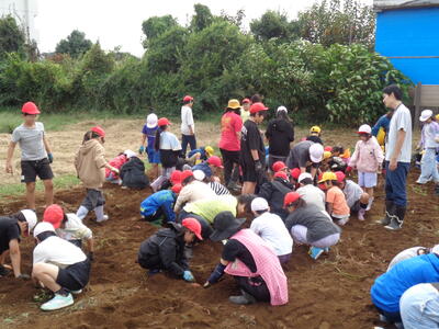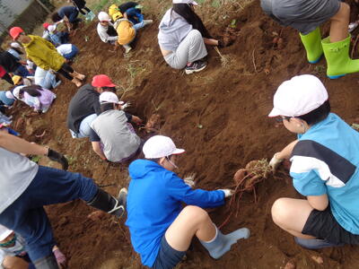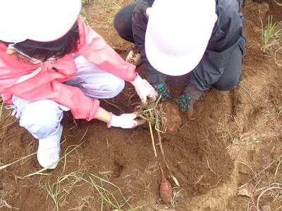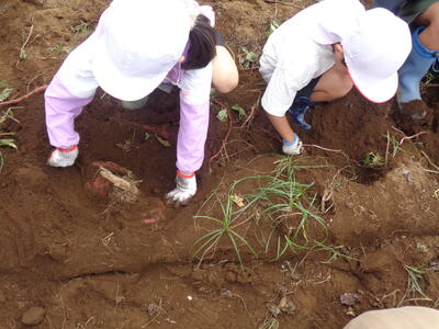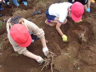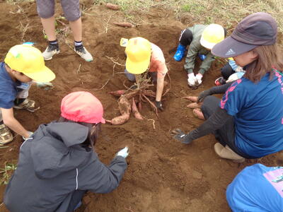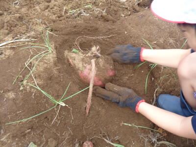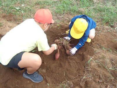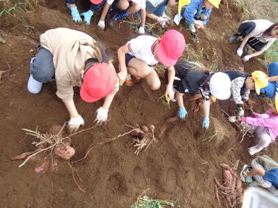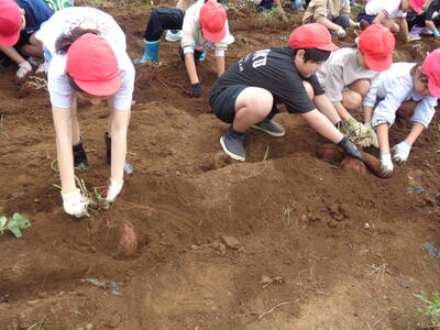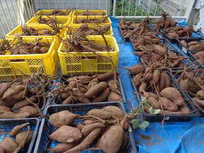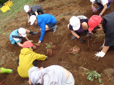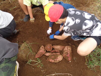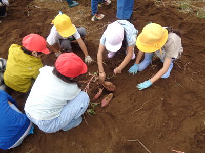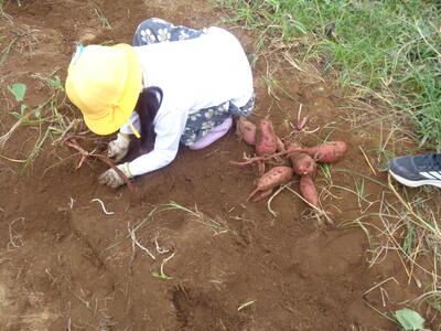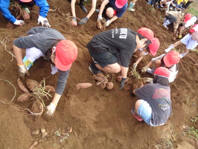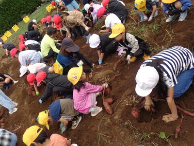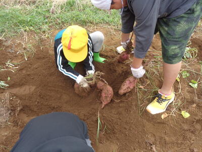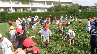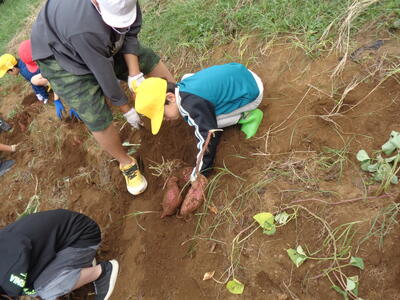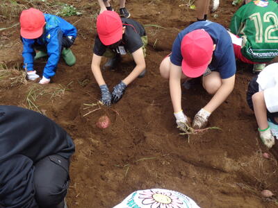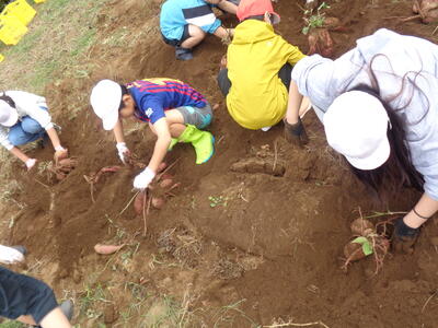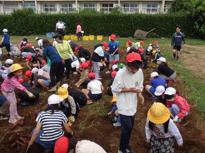 今日は農園のサツマイモを収穫しました。夏休み前、夏休み中も用務員さんが草刈りなど行っていて、時にはPTAの方々にも手伝っていただきました。