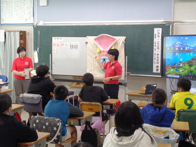 担任による紙芝居、栄養教諭K先生のお話の後、チャレンジカードを使って5級から1級まで挑戦しました。