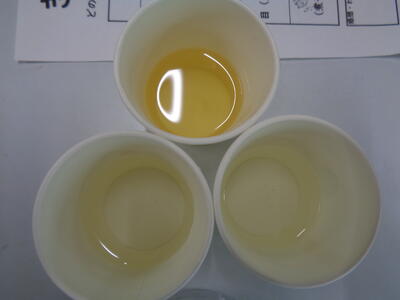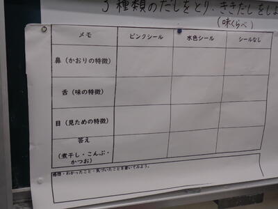 にぼし、こんぶ、カツオ節の3種類のだしを取り、味見をして色、香り、味を比べ、最後に味噌汁に使いました。