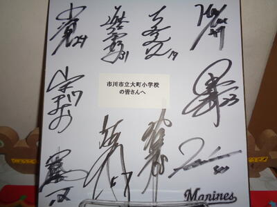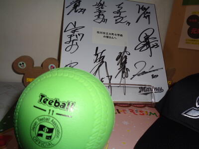 3,4年生全員にロッテのキャップ、12人のアカデミーコーチのサイン色紙、Tボールをお土産にいただきました。