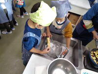 わんぱく農園で収穫したサツマイモを1,6年生が一緒に調理しました。6年生に手ほどきを受ける1年生は、包丁で恐る恐るサツマイモをサイコロ状に切りました。