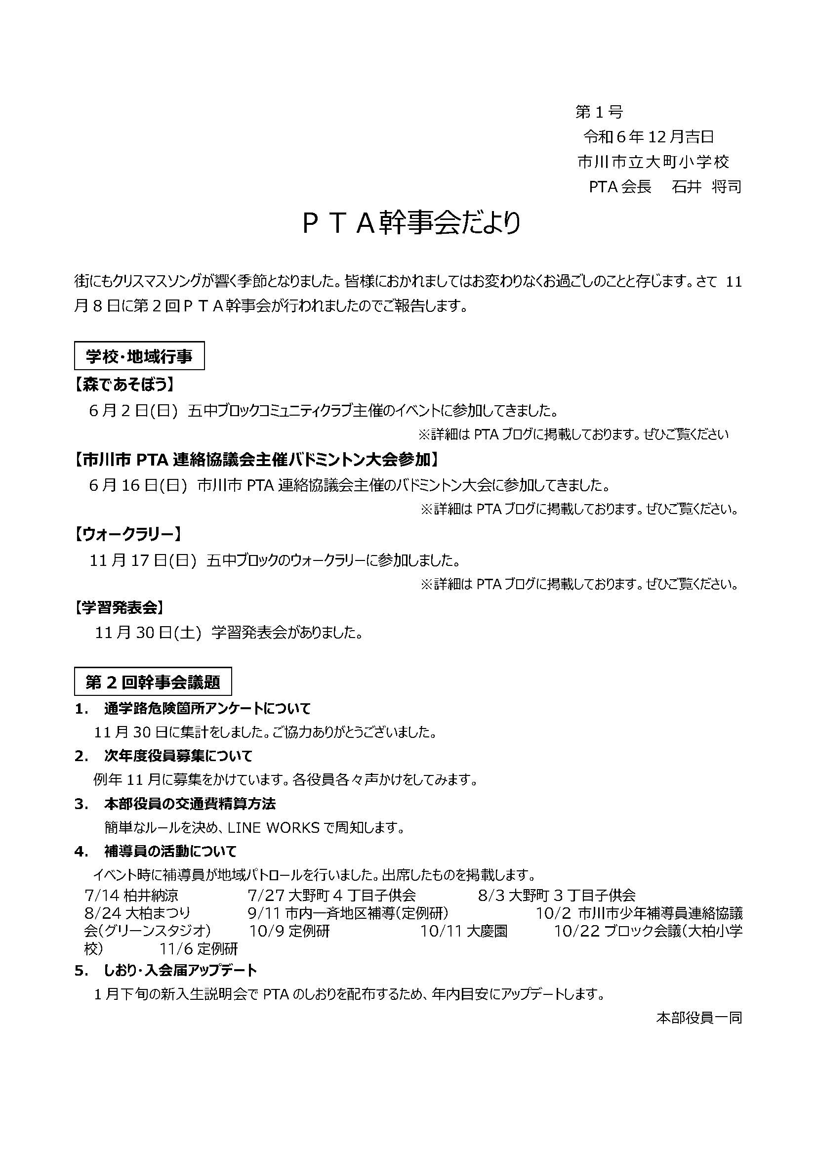 主に通学路アンケートの結果集計、次期本部役員募集について、会計のデジタル化、市川市P連会議出席等のための交通費等PTA会費の精算方法とルール化などについて話し合いました。