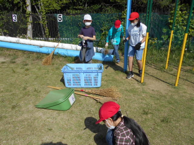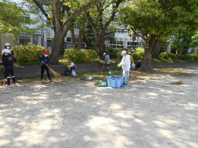 今年度、はじめてたてわり活動で朝清掃(外)を行いました。