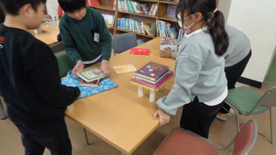 アニマシオンの手法の一つを使った活動です。読んだ内容と関連付けて工作で表すので、記憶にも残りやすいですね。