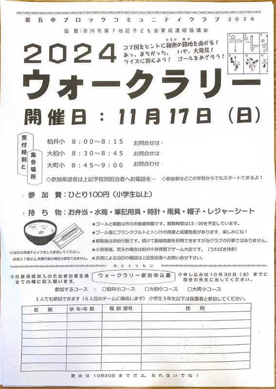 大町小PTAでは、五中ブロックコミュニティクラブ主催のウォークラリーのお手伝いを行っています。