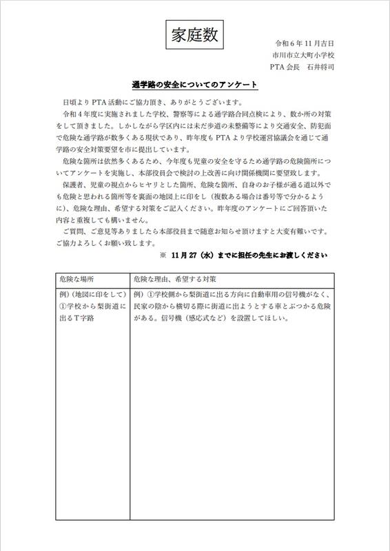 「通学路の安全についてのアンケート」および「次年度役員募集」を先日配布しました。