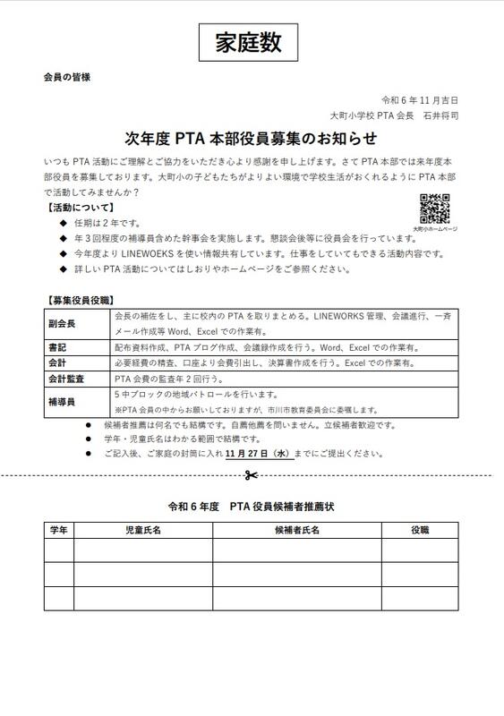 いつもPTA活動のご理解、ご協力ありがとうございます。