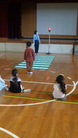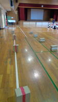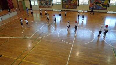 1,2年生がカラーコーン、ダンボール箱、フラフープなどを障害物を使って体の使い方を楽しみながら学んでいます。