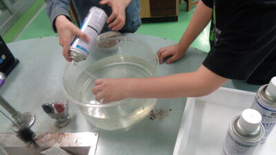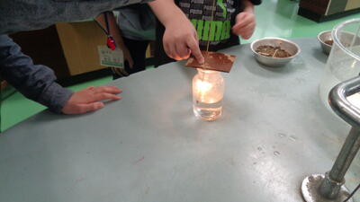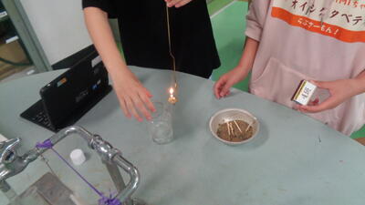 酸素、二酸化炭素、窒素の空気の成分別に燃え方を観察します。実験の様子をタブレットで撮影して、あとから見直したり、話し合ったりします。