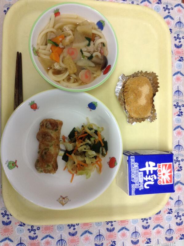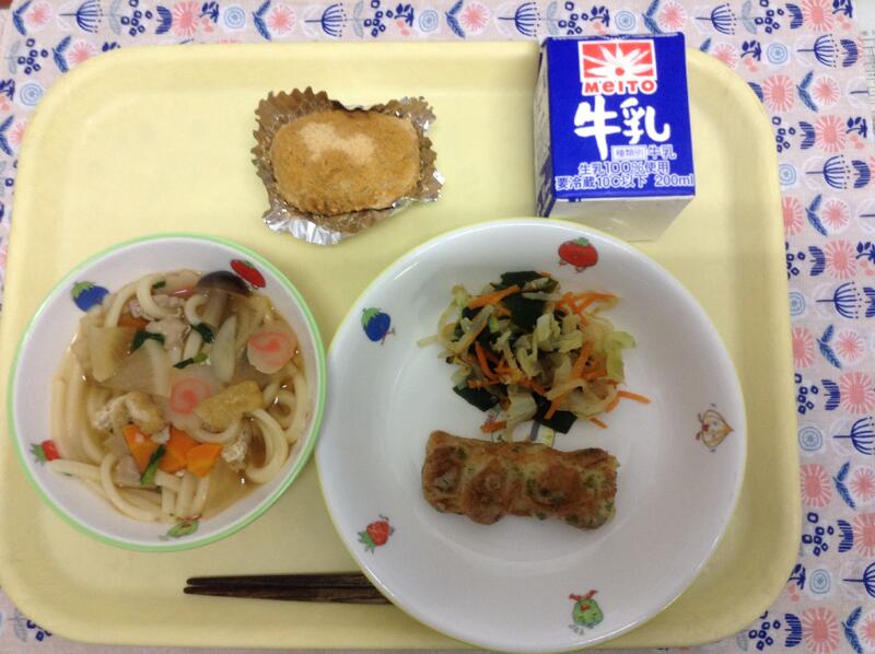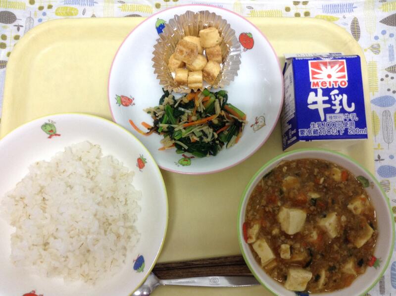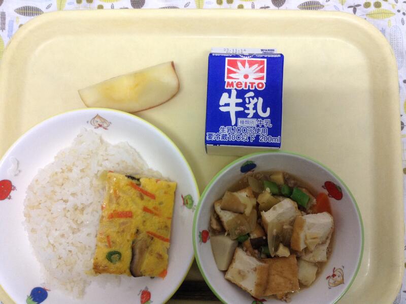 給食がはじまりました。今月は、PTA会長さんより大町のおいしい梨を納入していただき、色々な料理に登場します。