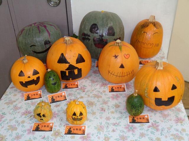 地域の方や校内でとれたカボチャに、各学年の子どもたちが顔を描きました。