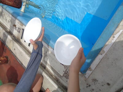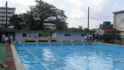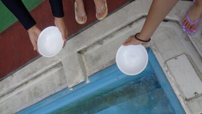 4年生が出発する前に、1,2,3年生のプール開きが行われ、安全祈願のお清めの塩をまき、天国のシャワーを浴びた後、プールに入りました。