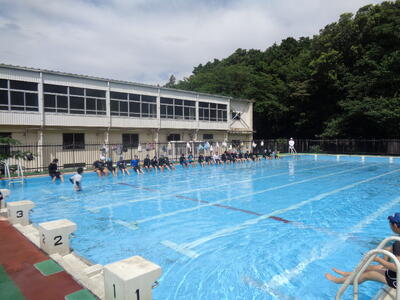 高学年が塩をまいてお清めをし、水泳学習の安全を祈りました。晴れてはいましたが、風があり、雲も多かったので、暑くなく、快適でした。命を守る水泳学習を大切にしたいと思います。