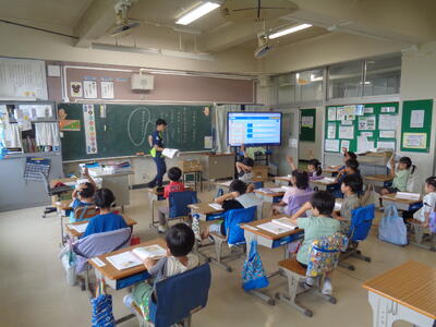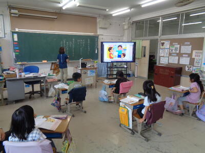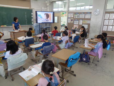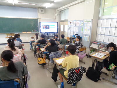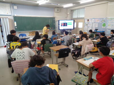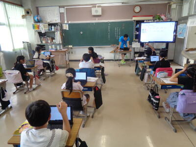 教科書だけでなく、デジタル教材でイラストと音声動画で理解しやすくなっています。意見の交換にはタブレットを使い、恥ずかしくて発表できない児童の意見も知ることができます。