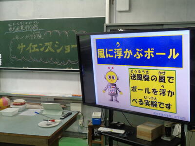 朝会後、サイエンスショーを低学年、高学年に分かれて理科室で見ました。低学年は風力実験で、空気砲の体験をしました。