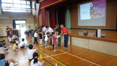 3年生にはハロウィーンにちなんで、がい骨の絵本を紹介し、その後、紙のがい骨を作成して、子どもたちが名前をつけました。とても面白い話でした。
