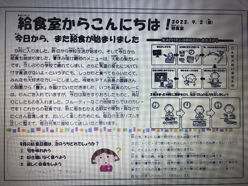 2022年9月の記事一覧 2022年9月 全ての記事 アーカイブ 2025年12月 (33) 2025年11月 (2) 2025年10月 (21) 2025年9月 (24) 2025年8月 (0) 2025年7月 (7) 2025年6月 (28) 2025年5月 (9) 2025年4月 (11) 2025年3月 (10) 2025年2月 (18) 2025年1月 (17) 2024年12月 (14) 2024年11月 (25) 2024年10月 (18) 2024年9月 (16) 2024年8月 (0) 2024年7月 (16) 2024年6月 (16) 2024年5月 (21) 2024年4月 (63) 2024年3月 (8) 2024年2月 (0) 2024年1月 (16) 2023年12月 (12) 2023年11月 (0) 2023年10月 (18) 2023年9月 (12) 2023年8月 (0) 2023年7月 (39) 2023年6月 (10) 2023年5月 (11) 2023年4月 (20) 2023年3月 (0) 2023年2月 (20) 2023年1月 (17) 2022年12月 (6) 2022年11月 (17) 2022年10月 (26) 2022年9月 (11) 2022年8月 (0) 2022年7月 (21) 2022年6月 (13) 2022年5月 (30) 5件 1件 5件 10件 20件 50件 100件 9月2日 投稿日時 : 2022/09/11 大町小学校管理者 おおまちの梨カレー わかめサラダ フローズンゼリー(ゆめオレンジ) 大町の梨が美味しい季節になりました!楽しみですね♪ « 123