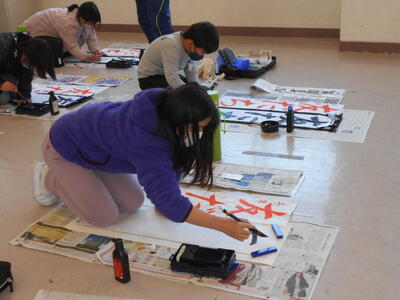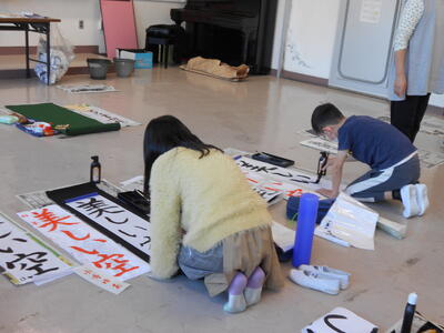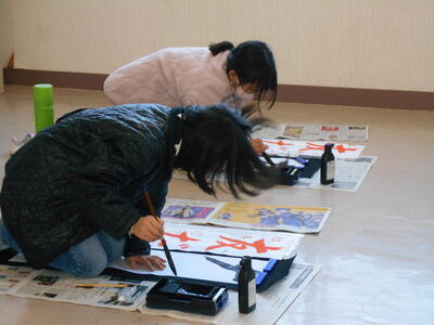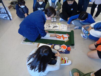 書道の先生の亀山先生からご指導いただき、書き初めの練習に取り組みました。
