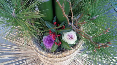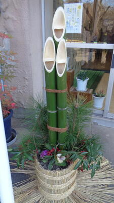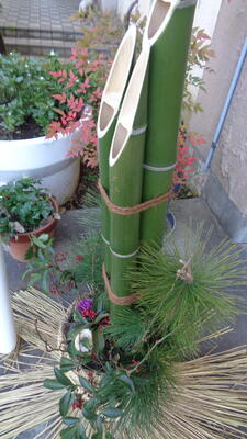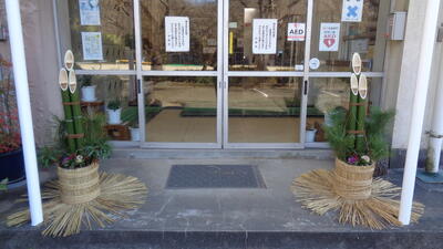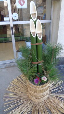 用務員さんと児童ボランティアが本物の竹で作った門松を職員玄関前に飾ってあります。ご来校の際にご覧ください。