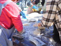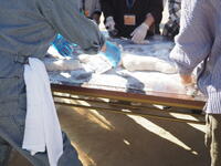保護者ボランティアの皆様は、餅を小分けするテーブルの準備を。