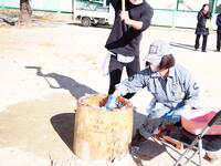 かまどに火を入れ、杵や臼をセッティング。