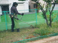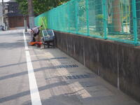 気温の上昇とともに、下草の伸びも著しくなり、毎日草刈り機を動かさねばならない用務員さん。