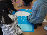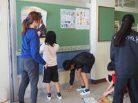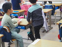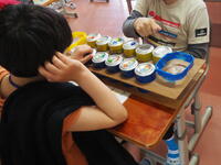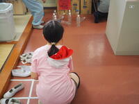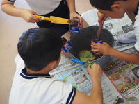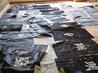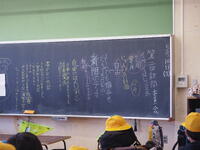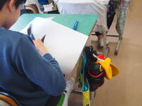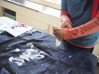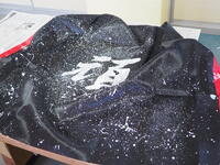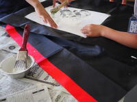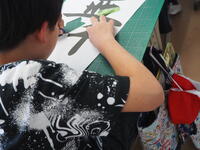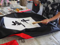 5年生が、ソーラン節で使うはっぴに一文字を描きました。