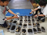 5月2日、大町小学校からいただいたカブトムシの幼虫の姿が見たくて、休み時間になると大野っ子が集まってきます。