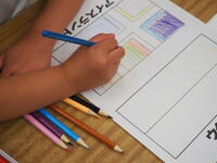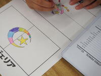 内科検診の待ち時間を利用して、1年生が万国旗の色塗りをしていました。