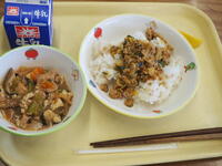 給食が始まりました。餃子の具丼、ご飯がすすむ逸品でした。