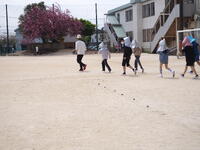 業間休み、先生たちも一緒におにごっこやドッジボールを。校庭が広いので追いかけるの大変そう・・・。
