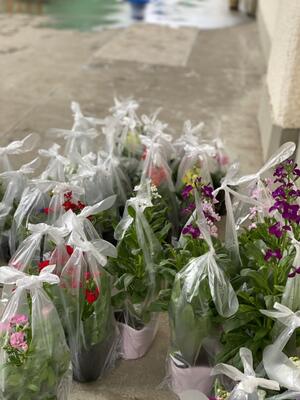 看板を掲げてくれているお宅やお店へ、僕たち私たちの安心安全を見守ってくれてありがとうございます、そんな感謝の気持ちをお花を持って届けに来ました。