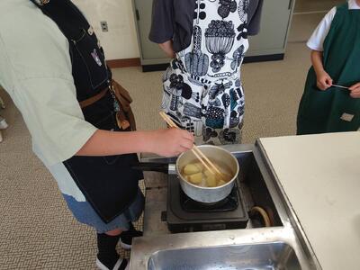 保護者ボランティアは、じゃがいもの芽を取る手本を見せたり、じゃがいもの茹で加減を確認する竹串の刺さり具合を見たりと、家庭料理の経験を活かした補助をしました。