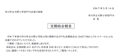 過日、書面によるPTA総会にご参加、決議いただきまして誠にありがとうございました。