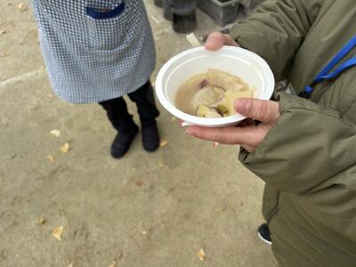 最後に豆まきならぬお菓子まきと、みんなで豚汁を食べて終了となりました。