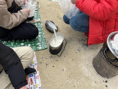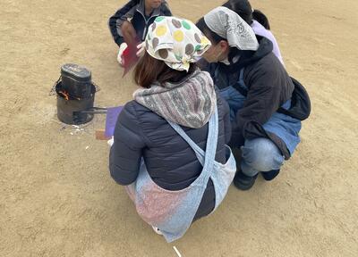 12月19日、小雪がチラつく寒い中、5年生の飯盒炊さんといちベジ味噌汁づくり、および3年生と6年生の焼き芋づくりのお手伝いを、保護者ボランティアで募った保護者の皆さんでおこないました。