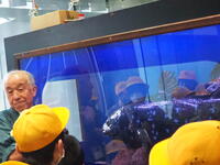 「食物連鎖だね。みんなもステーキやお刺身を食べるでしょう。同じだね。」と金魚を水槽に。