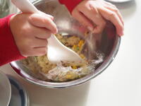 ご飯に片栗粉を混ぜて粒が無くなるまでつぶします。