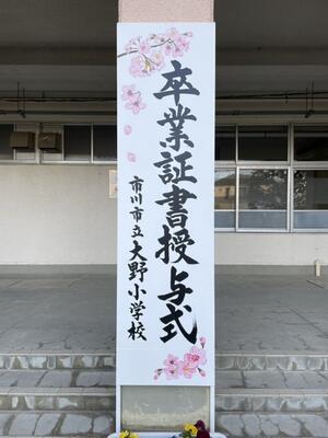 大野小では卒業生が書いた大書が館内一面に飾られますが、それに沿う形で紅白幕を用意させていただきました。より一段と祝賀の雰囲気になったのではないかと思います。この紅白幕は、入学式でも使用される予定です。