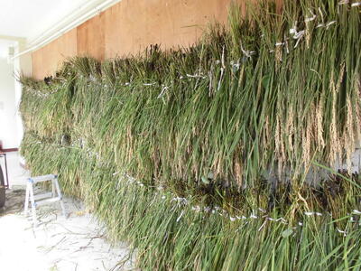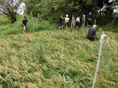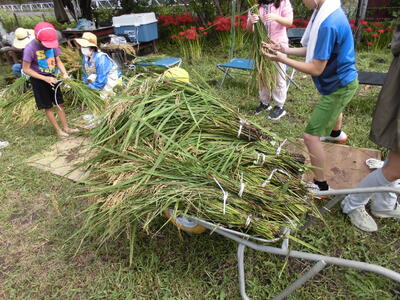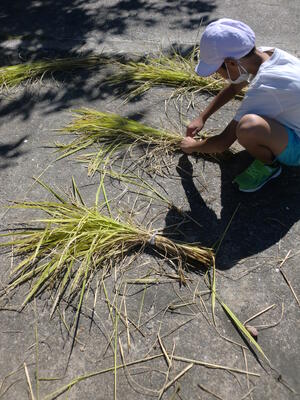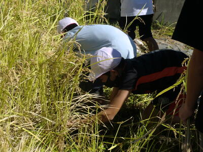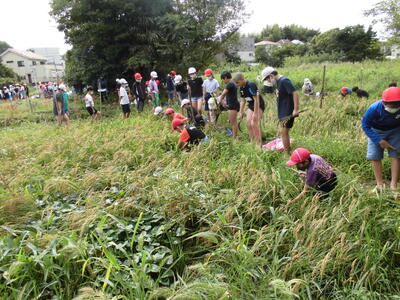 9月21日、5年生は大柏川遊水池緑地にある田んぼに稲刈りに行きました。