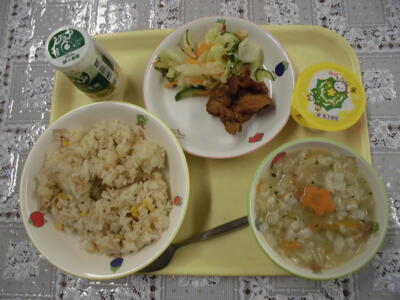 ツナピラフ、フライドチキン、フレンチサラダ、コンソメスープ、ゼリーです。