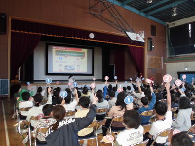 ガムを噛む実験やクイズを交え、子どもたちは楽しそうに学習に取り組んでいました。