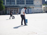 朝から先生たち総出で、ソフトボール投げ計測用のライン引きを。