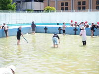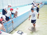 ボランティアの皆さんやジュンサイを守ろう市民の会の皆様、先生たちでヤゴを救いプールサイドへ。
